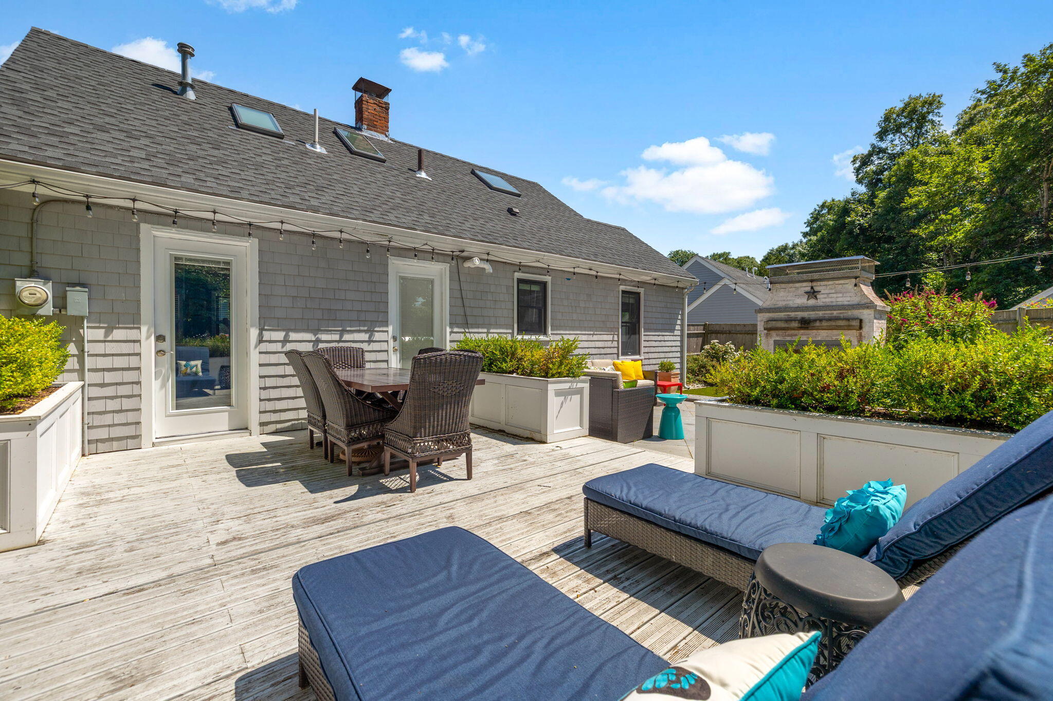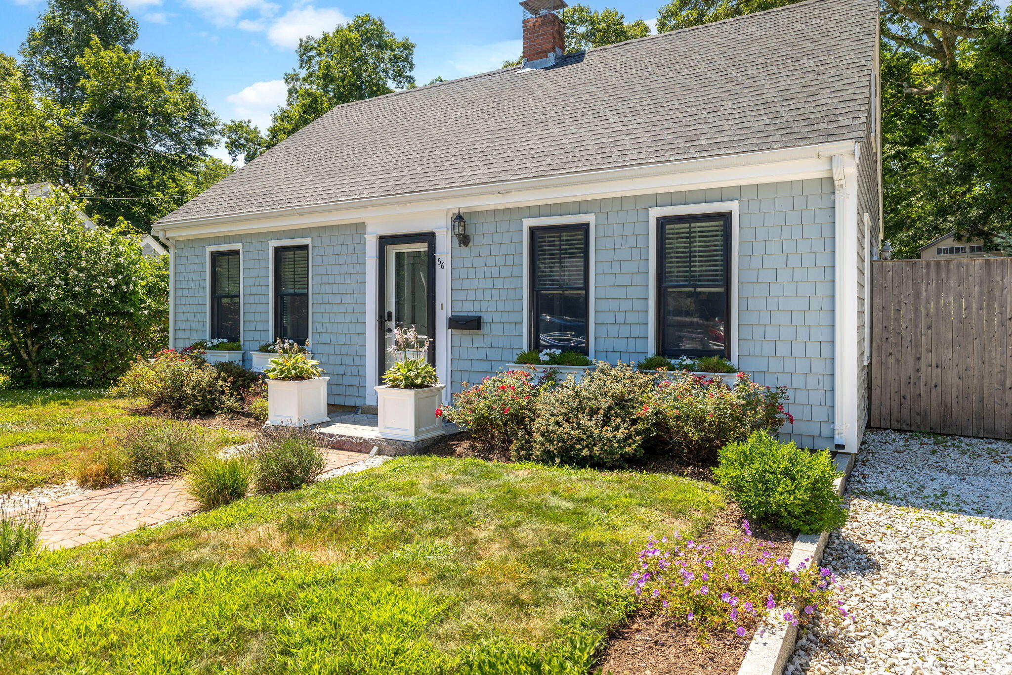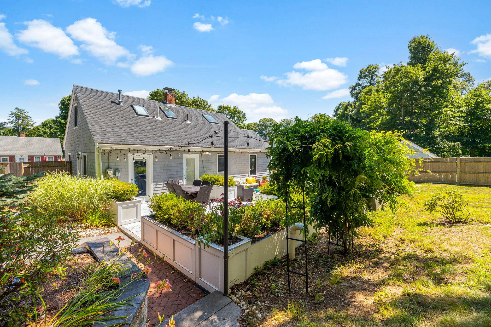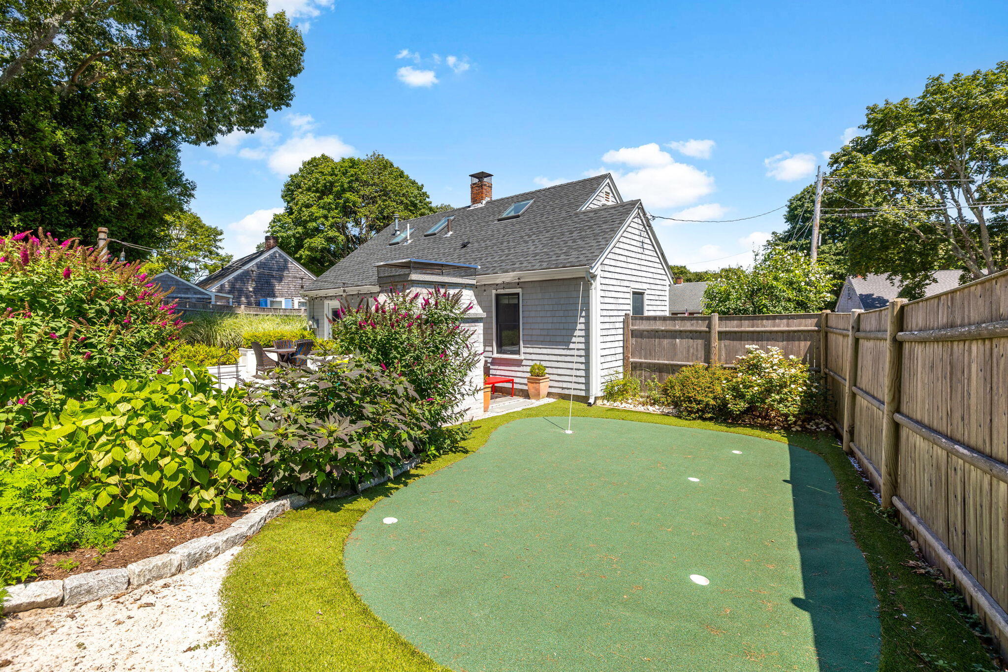Welcome to a home a half mile from the center of Falmouth Village. The entire property reads like a story book beginning with a herring bone brick walkway lined with lavender perennials & lush blooming gardens all around. An interior that greets you with sophisticated colors, built in bookcases, exposed brick accents in an open flow space leading to a modern kitchen. Through the backdoor is an oasis of purposeful plantings surrounding custom stonework creating ideal outdoor living spaces with a focal point wood burning fireplace & designated grilling station. The custom flower box planters carve out spaces used for dining & lounging with a crafty putting green. Additionally, the open lawn gives room for games, gardening & a storage shed. Back inside the remaining first floor include a primary, second bedroom and full bathroom. The second floor is sundrenched & accessed through a bookshelf that hides the staircase with a custom-built swinging door. At the base of the stairs is a laundry nook. Up the winding staircase is the quietest den and office nook. This area can also be used as the third bedroom. Home can be sold with the majority of furnishings in place.