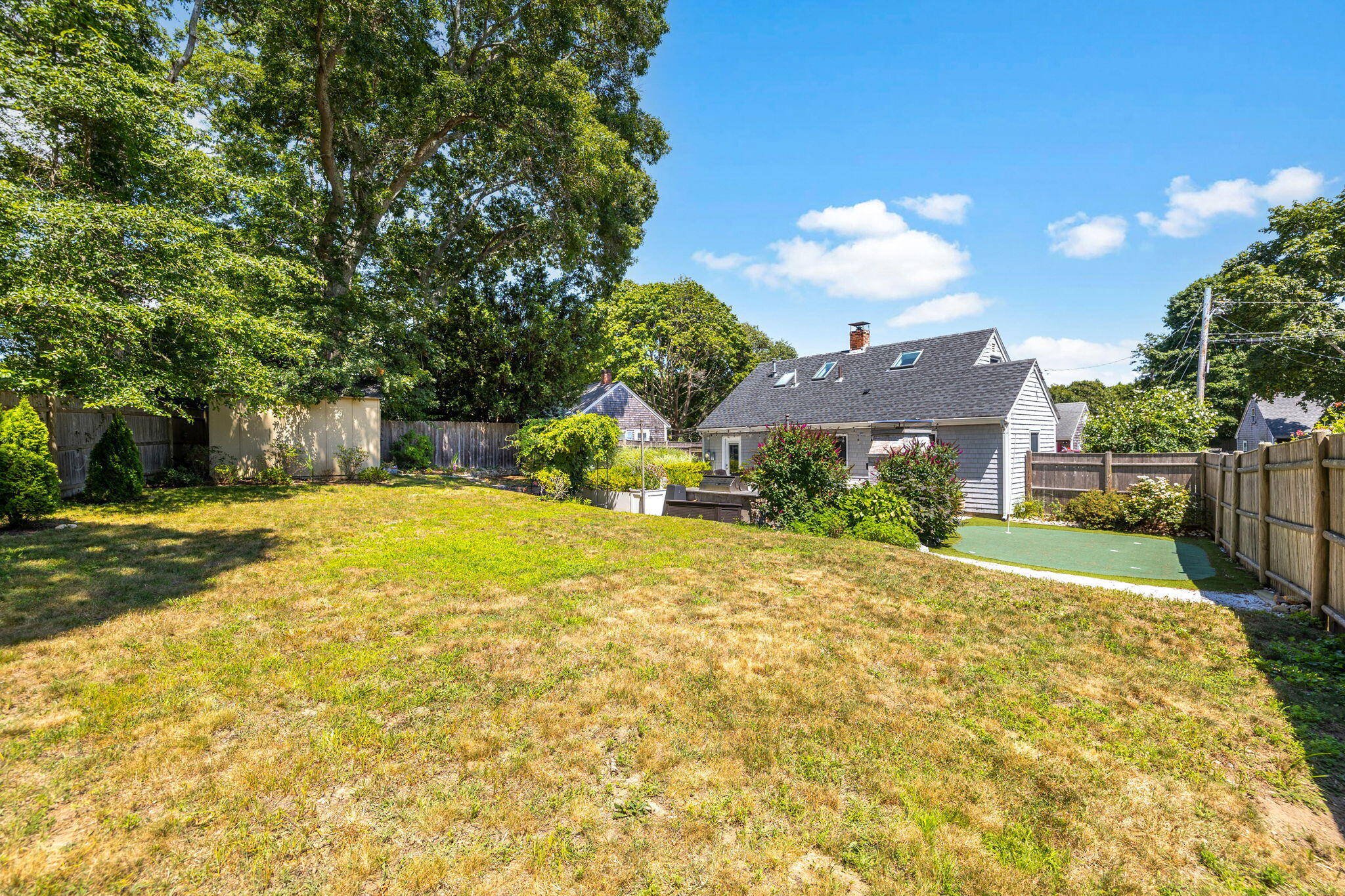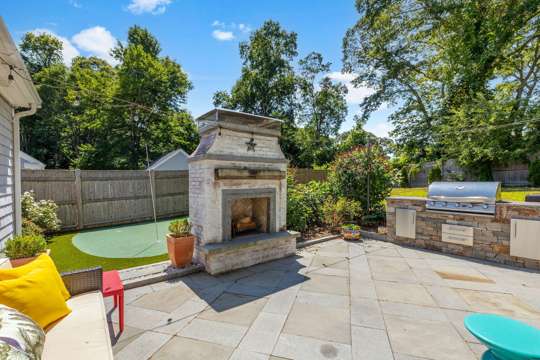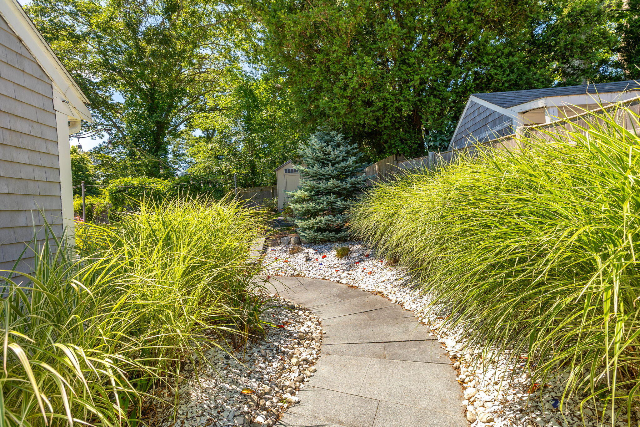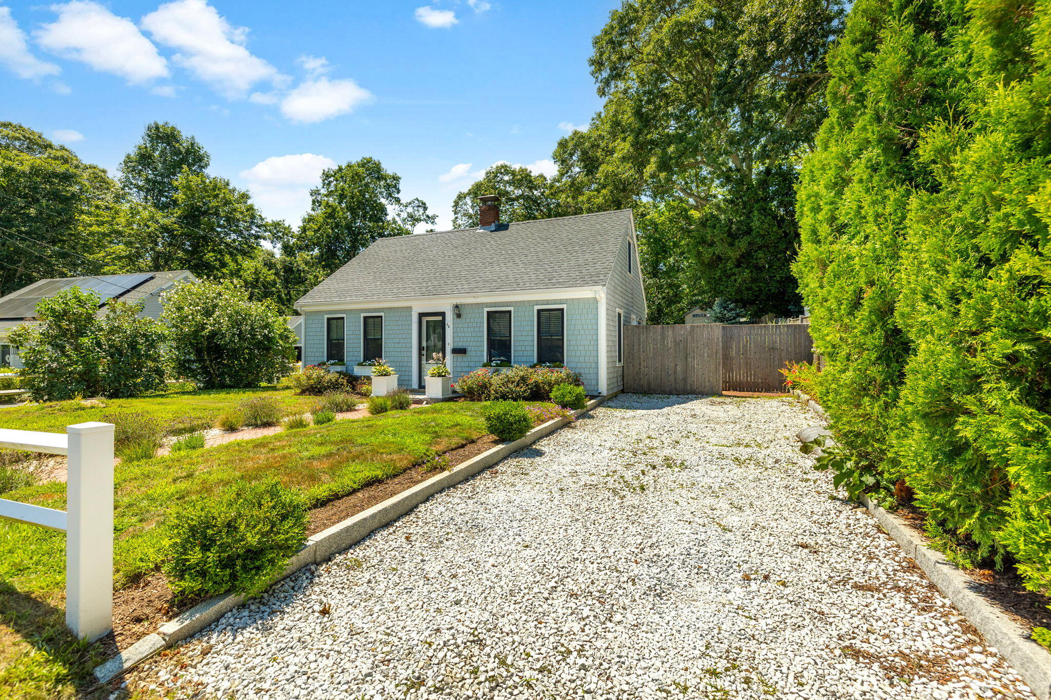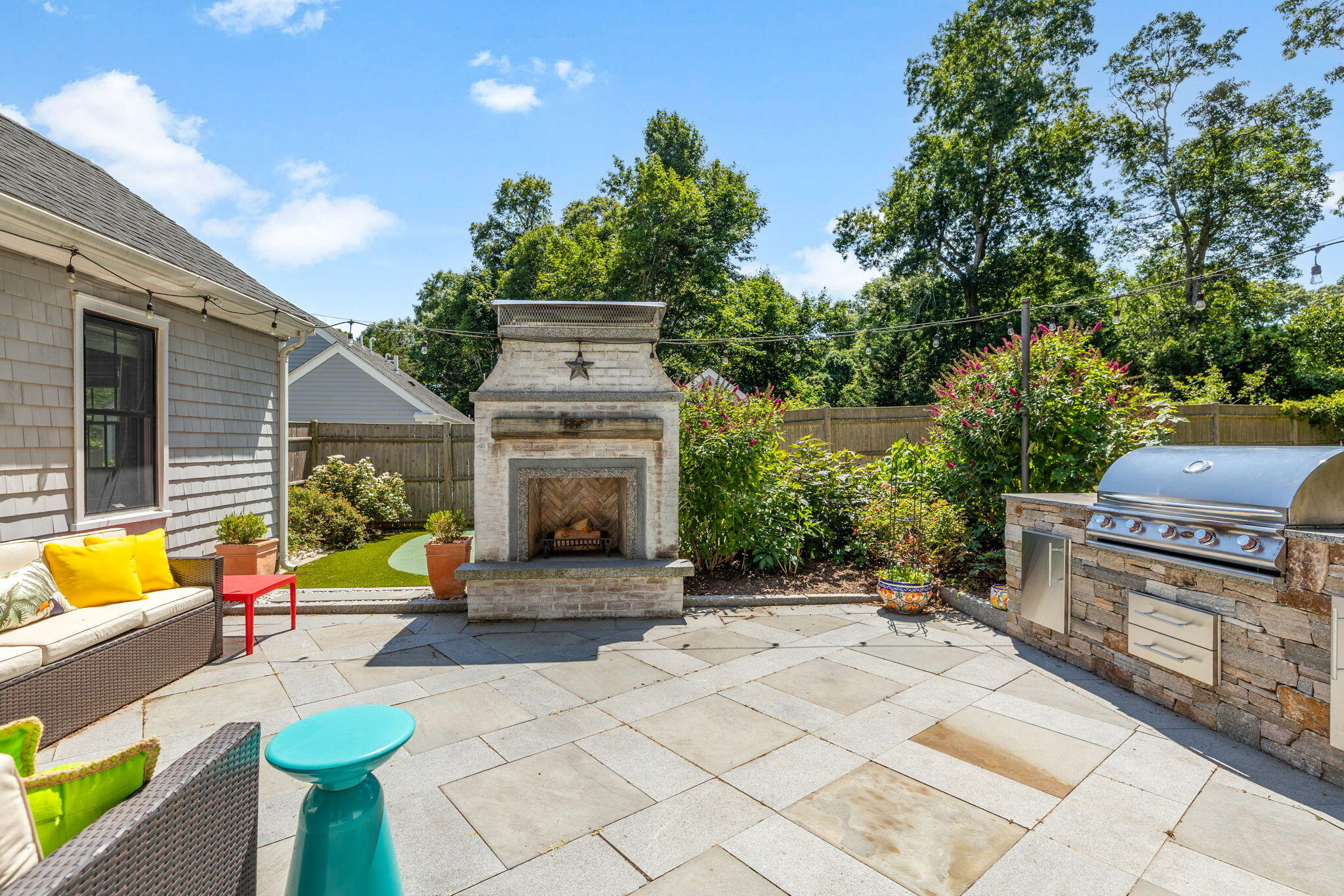 Welcome to a home a half mile from the center of Falmouth Village. The entire property reads like a story book beginning with a herring bone brick walkway lined with lavender perennials & lush blooming gardens all around. An interior that greets you with sophisticated colors, built in bookcases, exposed brick accents in an open flow space leading to a modern kitchen. Through the backdoor is an oasis of purposeful plantings surrounding custom stonework creating ideal outdoor living spaces with a focal point wood burning fireplace & designated grilling station. The custom flower box planters carve out spaces used for dining & lounging with a crafty putting green. Additionally, the open lawn gives room for games, gardening & a storage shed. Back inside the remaining first floor include a primary, second bedroom and full bathroom. The second floor is sundrenched & accessed through a bookshelf that hides the staircase with a custom-built swinging door. At the base of the stairs is a laundry nook. Up the winding staircase is the quietest den and office nook. This area can also be used as the third bedroom. Home can be sold with the majority of furnishings in place.