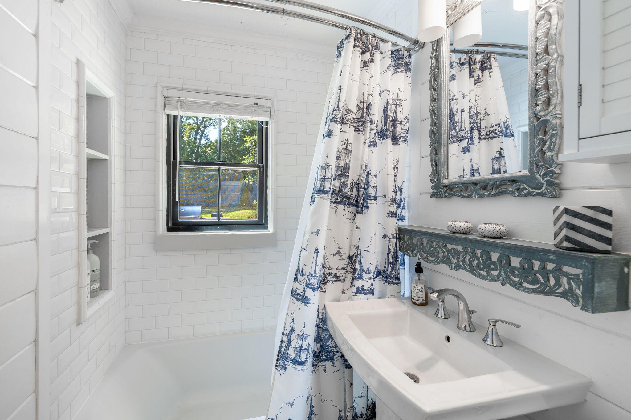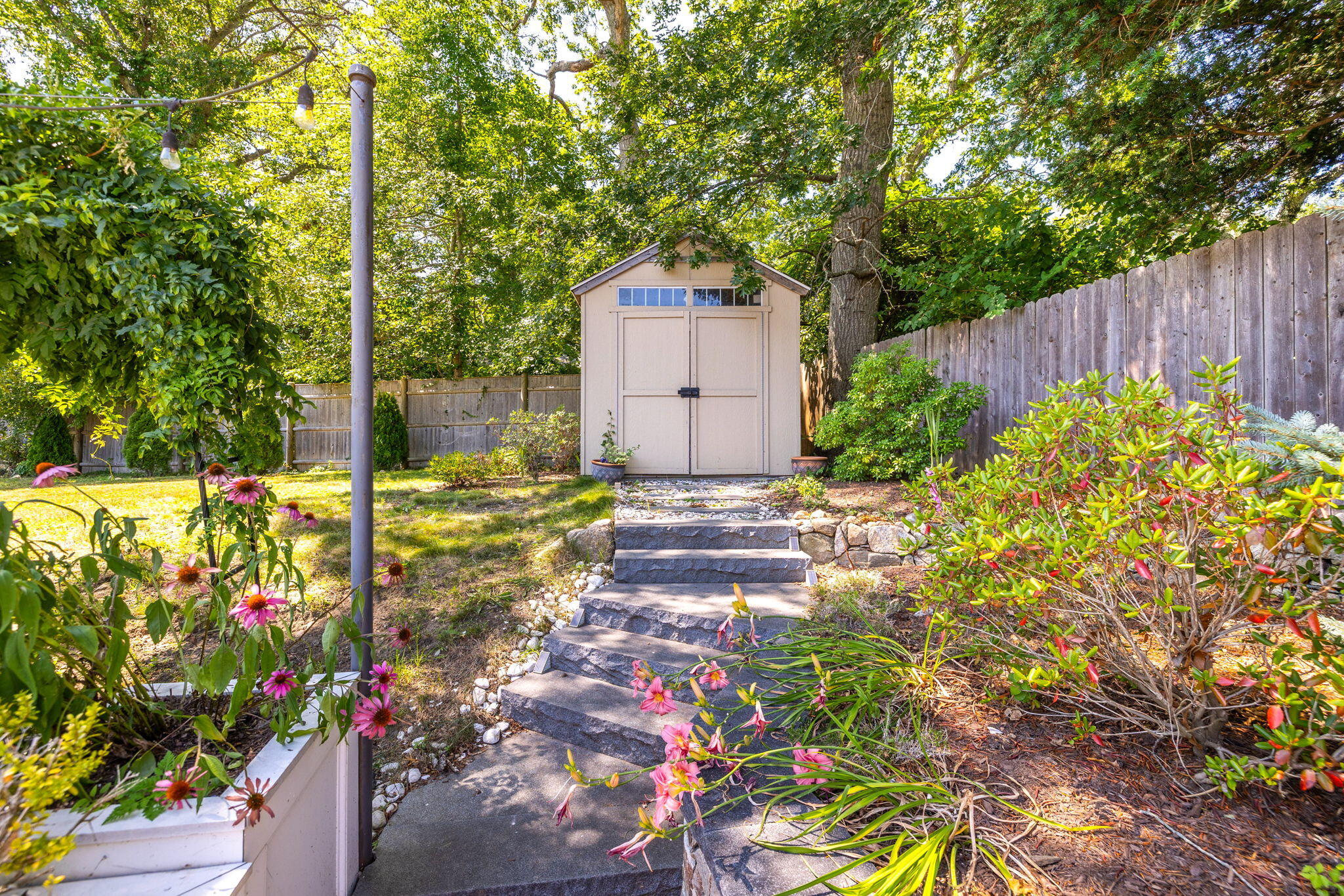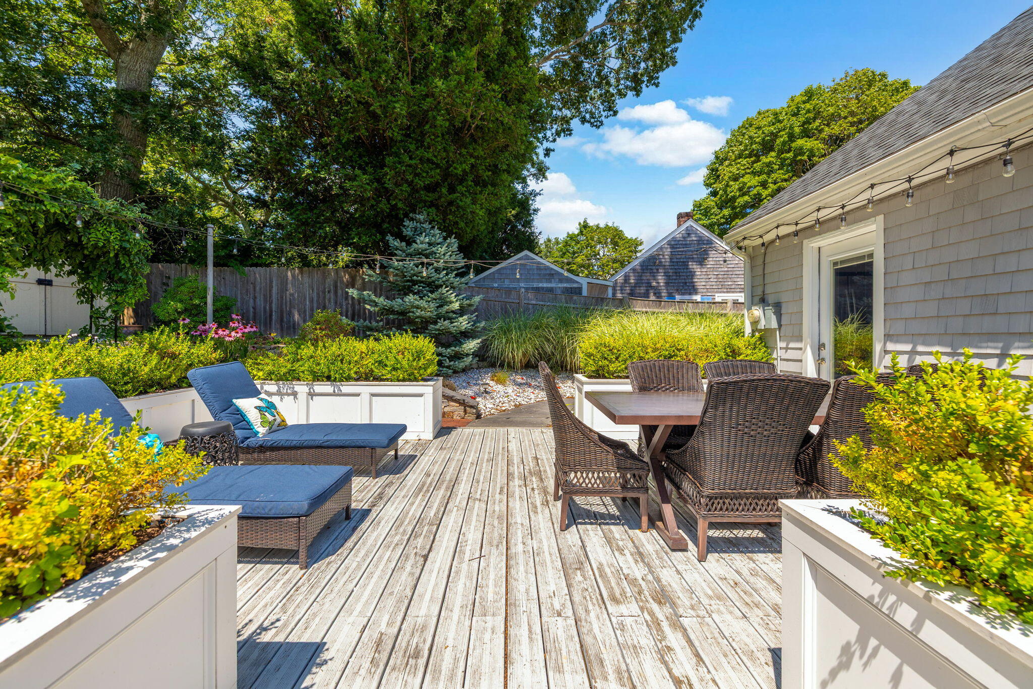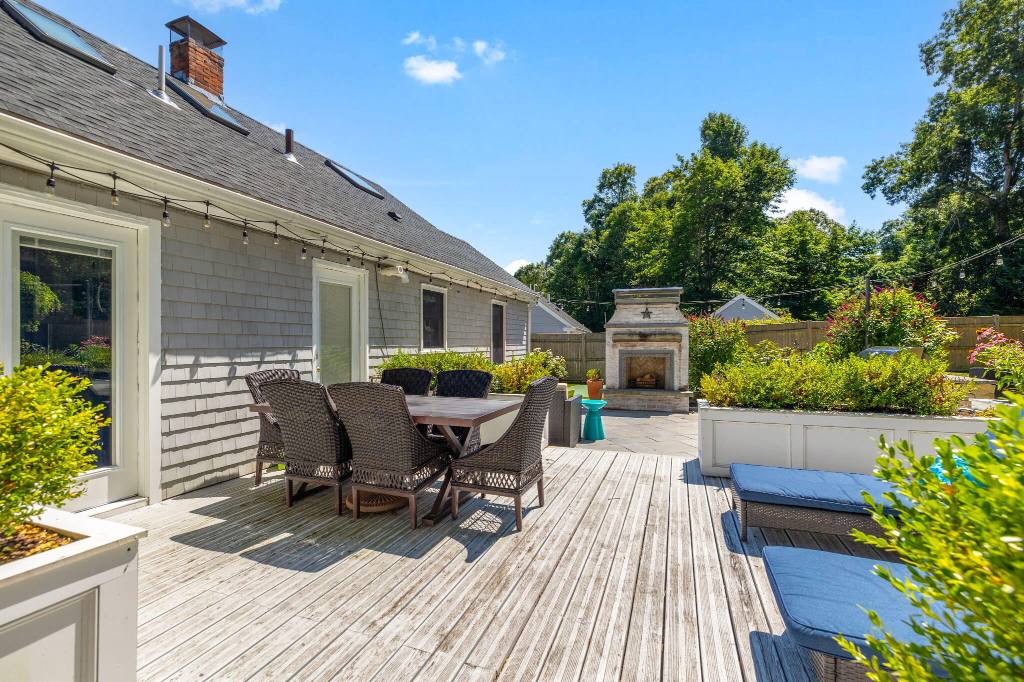 Welcome to a home a half mile from the center of Falmouth Village. The entire property reads like a story book beginning with a herring bone brick walkway lined with lavender perennials & lush blooming gardens all around. An interior that greets you with sophisticated colors, built in bookcases, exposed brick accents in an open flow space leading to a modern kitchen. Through the backdoor is an oasis of purposeful plantings surrounding custom stonework creating ideal outdoor living spaces with a focal point wood burning fireplace & designated grilling station. The custom flower box planters carve out spaces used for dining & lounging with a crafty putting green. Additionally, the open lawn gives room for games, gardening & a storage shed. Back inside the remaining first floor include a primary, second bedroom and full bathroom. The second floor is sundrenched & accessed through a bookshelf that hides the staircase with a custom-built swinging door. At the base of the stairs is a laundry nook. Up the winding staircase is the quietest den and office nook. This area can also be used as the third bedroom. Home can be sold with the majority of furnishings in place.